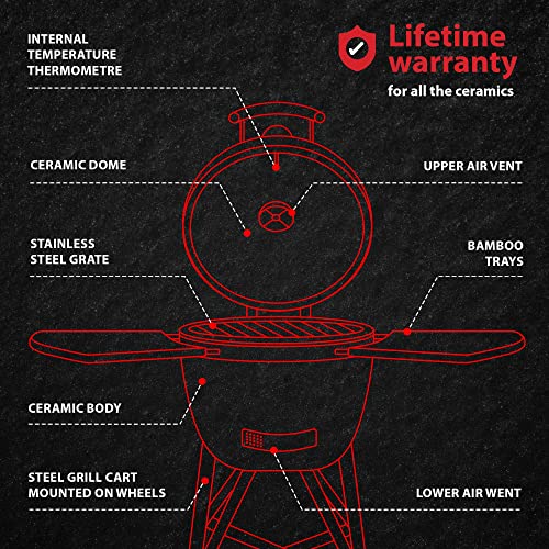 LEVENSLANGE GARANTIE: Al het keramiek in onze houtskoolbarbecues heeft een levenslange garantie, maar het gietijzeren houtskoolrooster, de bovenste ventilatie en de roestvrijstalen functies garanderen levenslang gebruik zoals het is.