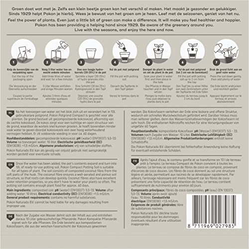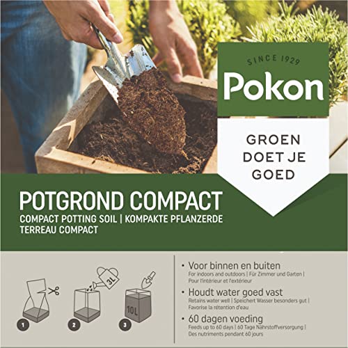 Pokon compact potgrond is een lichtgewicht potgrond geschikt voor kamerplanten en voor buitenplanten. na het toevoegen van water zet het blok zich uit en verandert het in 10 liter gebruiksklare potgrond. pokon compact potgrond bestaat uit gecomposteerde kokosvezel, afkomstig van de zachte kokosbast. de kokos zorgt voor een luchtige en open structuur van de grond. hierin kunnen plantenwortels gemakkelijk groeien. doordat kokosvezels een hoog water opnemend vermogen hebben, hoef je je plant minder vaak water te geven.  deze potgrond bevat 60 dagen voeding.   gebruiksaanwijzing: knip de bovenzijde van de verpakking open. voeg 3 liter water toe aan de verpakking en wacht enkele minuten tot de grond zich volledig heeft uitgezet. plant oppotten: doe een laagje hydrokorrels (20-25%) in de pot. vul de pot met de potgrond. dompel de kluit van de plant in water en zet de plant in de grond. vul de pot met potgrond. houd 2 cm aan de bovenrand over zodat je gemakkelijk water kunt blijven geven. druk de grond licht aan en geef ruim water. tip: planten hebben naast water, ook voeding nodig. na 60 dagen is de aanwezige voeding in deze potgrond verbruikt. vergeet daarom niet je plant alsnog van voedingsstoffen te voorzien door middel van een vloeibare voeding. samenstelling: gecomposteerde kokosvezel