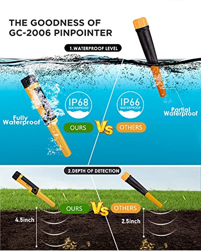 IP68 VOLLEDIG WATEROF TOT 20 Meter Onderwater: bij alle weersomstandigheden, zware regen, zelfs in de meren, rivieren, vijvers en oceanen, kunt u de pinpointer nemen om schatten te lokaliseren die andere zoekers niet kunnen vinden. Andere toonaangevende detectoren gaan slechts 4 meter omlaag en kunnen niet volledig in water worden ondergedompeld. Onze volledig dompelbare 20 meter diepte geeft u een groot voordeel.