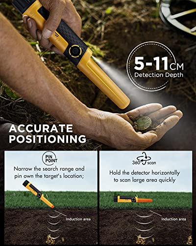 Hoge gevoeligheid & 360 graden DETECTIE: de metaaldetector met geavanceerde chips en hoogwaardige materialen zorgt ervoor dat de gevoeligheid met ongeveer 50% toeneemt dan gewone metaaldetectoren, betekent 50% meer mogelijkheid om schatten te vinden. 360 graden scannen stelt u in staat om de metaaldetector horizontaal te houden om snel groot gebied te scannen en uw detectieveld te verkleinen voor het nauwkeurig bepalen van grotere doelen.
