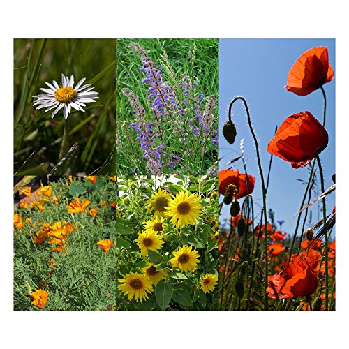 Deze zaadset bevat 5 kleurrijke, éénjarige zomer bloemen soorten : Wilde Salie, Madeliefjes, Californische gouden papaver, Zonnebloemen en Klaproos