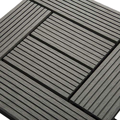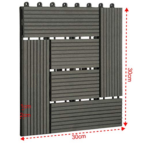 Set van 22 – 2 m²: de WPC-terrastegels zijn 30 x 30 cm groot. De terrastegels kunnen met een zaag gemakkelijk worden gesneden, als de ruimte aan de rand voor een complete tegel niet voldoende zou kunnen zijn. De tegels kunnen met andere kleuren van de tegels worden gecombineerd. Bovendien kunnen de WPC-terrastegels met steen-kliktegels of gazonstromen worden gecombineerd.