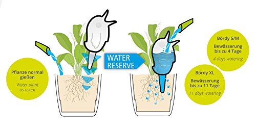 Bördy is de schattige irrigatiehulp van uv-bestendige, doorschijnende kunststof. Als waterreservoir voorziet hij planten in de tuin, op het terras en balkon en in de woonkamer van water – vooral als je een paar dagen niet thuis bent. Afhankelijk van de grootte, locatie en dorst van de plant voor maximaal 11 dagen. Dat vindt ook de Stiftung Warentest echt “GUT” (1,6)!